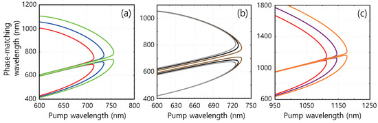 (a) Phase-matching curves of the signal and idler as a function of the pump wavelength at 610 nm (red), 615 nm (blue), and 630 nm (green) in diameter. Average pump power is 0.5 mW. (b) Power dependence of the phase-matching curves at 1.0 mW (brown), 5.0 mW (black), and 10 mW (gray) in average pump power. Here, d is fixed at 650 nm. (c) Phase-matching curves of the signal and idler as a function of the pump wavelength at 900 nm (red), 925 nm (purple), and 950 nm (orange) in diameter. Average pump power is 0.5 mW.