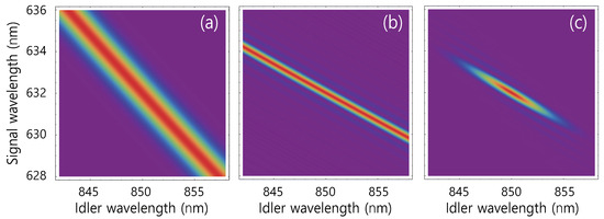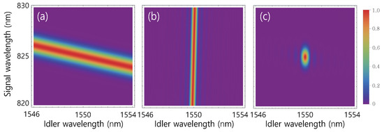 (a) Pump envelope function, , governed by energy conservation. (b) Phase-matching function, , governed by momentum conservation. (c) Joint spectral amplitude, , as expressed in Equation (24).