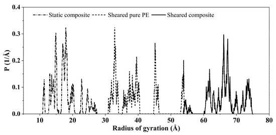 It can also be seen from Figure 3 that the mean radius of gyration (66.2 Å) of the PE molecular chains in the sheared composite system is not only higher than the sheared pure PE system and the static composite system, but also higher than the sum of the static composite system (17.5 Å) and the sheared pure PE system (39.9 Å). Therefore, compared with the single effect of shear flow and the CNT, the combination of the two has a more obvious effect on the size of the molecular chains.