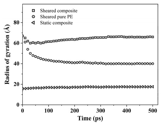 According to the distribution curve of the radius of gyration in Figure 2 and the evolution curve of the mean radius of gyration in Figure 3, the distribution interval (10.8 Å, 27.46 Å) of the radius of gyration of PE molecular chains in the static composite system is small, and the mean radius of gyration increases gently. This also shows that PE molecular morphology changes little and the adjustment induced by the CNT is limited in the static composite system, while the distribution range (53.84–74.86 Å) of the radius of gyration of PE molecular chains in the sheared composite system is markedly increased. The mean radius of gyration decreases a little initially, and then increases gradually. This also indicates that elastic shrinkage occurs to some extent, due to the viscoelastic properties of the molecular chains at a higher melt temperature after the cessation of shear. Subsequently, the molecular chains further extend under the action of the CNT. In particular, the distribution curve of the radius of gyration of the sheared pure PE system moves to the left, relative to the sheared composite system, and the distribution range decreases significantly. Moreover, the mean radius of gyration decreases sharply within 100 ps. This shows that the atoms migrate closer to the center of mass of the molecular chain at a higher temperature after the cessation of shear, the size of molecular chains decreases considerably, and the degree of bending and winding of the molecular chains rises quickly. Then, the radius of gyration gradually stabilizes with the decreasing temperature.