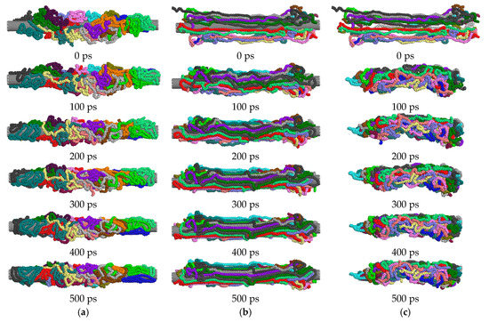 Figure 4 shows the conformation evolution process of PE molecular chains. As can be seen from Figure 4b, a certain degree of relaxation occurs in the PE molecular chains of the sheared composite system during the initial period after the cessation of shear. However, due to the adsorption effect of CNTs [28], relaxation of the molecular chains is inhibited, which stabilizes the conformation of the molecular chains. The principal axis of the molecular chains is still basically parallel to the Z-axis. Over time, and with decreasing temperature, the CNT induces PE molecular chains to adjust conformation along its axial direction, to increase the orderliness of their arrangement. As shown in Figure 4c, the sheared pure PE system, with the same extension degree as the PE chains in the sheared composite system, undergoes a significant conformation change after the cessation of shear. Without the restriction of the CNT, PE molecular chains relax considerably at a high temperature and rapidly evolve from orientation state to winding state. For the static composite system, as shown in Figure 4a, PE molecular chains are mostly distributed around the CNT in a disordered state at the beginning, and the number of molecular chains is large. Hence, the molecular chain segments are hindered by the surrounding molecular chain segments in the process of the CNT-inducing conformation ordering. Furthermore, for locations where the arrangement of molecular chains around the CNT is slightly sparse, the space for conformation adjustment is a little larger, and the molecular chain has different degrees of folding arrangement. However, for locations where the molecular chains are more densely arranged, the space for conformation adjustment is smaller, and the regularity is even worse.