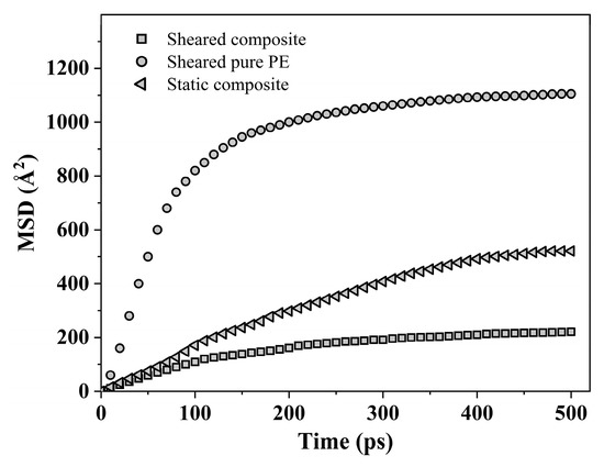 According to the change in the trend of MSD with time, as shown in Figure 5, the MSD values of the three curves increase most in their respective 100 ps, and the slopes of the curves are highest. According to the Einstein equation, the atomic diffusion coefficient D is one-sixth of the slope of the MSD curve, as shown in Equation (3) [29]. When the temperature is high, the energy of the system is correspondingly high, and the molecular chains easily overcome the migration barrier and cross the region of high potential energy. Thus, the diffusion of molecular chains is promoted, with a high diffusion coefficient and MSD value. Especially for the sheared pure PE system after the cessation of shear, the diffusion coefficient is much larger than those of the composite systems. For a linear chain polymer with good flexibility, the viscous flow activation energy is low. The viscous flow activation energy is the minimum energy required for the molecular chain segments to overcome the barrier and jump from the original position to the adjacent “hole”. Therefore, PE molecular chains can easily overcome the viscous flow activation energy, undergo a violent thermal movement, and shorten the relaxation time, which is the time required for the molecular chains to recover from the unstable orientation state to the low-energy winding state through molecular motion. Subsequently, the entanglement barrier is difficult to overcome with decreasing temperature, the relaxation speed decreases significantly, and the slope of the MSD curve decreases rapidly. Thus, the molecular chains migration weakens. However, the MSD of PE chains in the sheared composite system is markedly reduced. This occurs because the molecular chains movement slows down under the action of CNT adsorption, and the stretched state of PE chains is basically maintained. Thus, the molecular chain segments only need minor adjustments, and only migrate and diffuse within a small range. The slope of the MSD curve is very gradual. Compared with the sheared composite system, the molecular chain segments need to be adjusted slightly more under the induction of the CNT, due to the initial molecular chains of the static composite system, which are mainly in a random state. The migration and diffusion of the molecular chains are slightly stronger, and the MSD is slightly larger.
