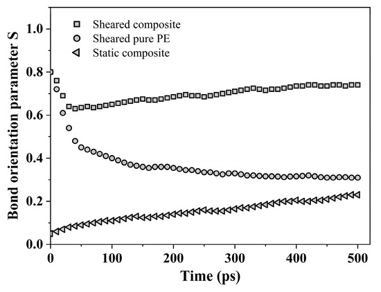 As shown in Figure 6, the bond orientation parameter of PE molecular chains in the static composite system slowly increases. The slight change further indicates that when the CNT is surrounded by multiple random polymer chains, the orientation of molecular chains induced by the CNT is finite under the restriction of the surrounding chain segments. The conformation evolution diagram also shows that the orientation of these chain segments is inconsistent. For a sheared pure PE system, the orientation induced by shear flow is unstable. The molecular chains are clearly disoriented and the bond orientation parameter is greatly reduced after the cessation of shear. For the sheared composite system after the cessation of shear, the bond orientation parameter decreases a little in a short time and then increases slowly. The degree of disorientation is much lower than that of the sheared pure PE system, which further indicates that the orientation stability of PE chains markedly improves under the adsorption effect of the CNT on shear-induced oriented chains and the inhibition effect of the CNT on the relaxation of shear-induced oriented chains. Moreover, the degree of orientation is further improved under the induction of the CNT.