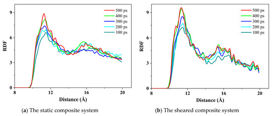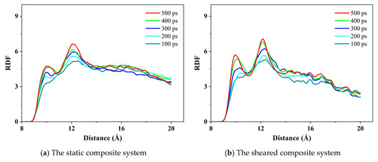 To further understand the effect of the orderly arrangement degree of molecular chains on interface binding energy, Figure 7 and Figure 8 respectively show the radial distribution function (RDF) of the hydrogen (H) atoms and carbon (C) atoms of PE molecular chains in the composite system under static and sheared conditions. It can be seen that the peaks of the curves become increasingly obvious over time and with decreasing temperature. At 500 ps, the position of the peak of C atoms is 4.5 Å from the surface of the CNT, and the position of the first peak of H atoms is 3.2 Å from the surface of the CNT, both of which are within the range of van der Waals forces (r = 3.1–5.0 Å). When the distance exceeds 5.0 Å, the van der Waals interaction is weak. Furthermore, the peak value of the sheared composite system is higher than that of the static composite system, which further indicates that the orderly arrangement degree of molecular chains under shear condition is higher than under static condition. The molecular chains in the sheared composite system are arranged more closely, so more H and C atoms are close to the surface of the CNT. Therefore, the van der Waals force increases, and the interface binding energy increases correspondingly. This also indicates that the interface interaction between PE molecular chains and CNTs can be enhanced to some extent through interface crystallization.
