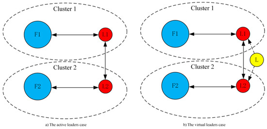 Figure 1 is a diagram of the step-by-step consensus controller. As shown in Figure 1, all agents are classified by the clustering algorithm in the last section, then select an agent as the leader in each cluster, i.e., L1 and L2. L1 in Cluster 1 and L2 in Cluster 2 are the active leaders in a), where they exchange information of their clusters with each other. L is the virtual leader in b), where L1 and L2 can receive the information from the leader. Accordingly, other agents in the set F1 and F2 will reach consensus under the guidance of their leader in each cluster. Every active leader in the cluster can play the role of active leader. For fast consensus, one can be select as active leader who has the largest number of neighbors. In order to save hardware/software, the virtual leader L should be incorporated into the active leader L1 and L2.