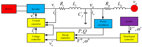 In order to realize the grid connection of BESS, frequency and voltage must restore to the nominal value of the grid. So, this paper introduces a virtual leader incorporated into a BESS, which can lead frequency and voltage of all BESSs to and . Improved inputs are shown in Equations (7) and (8).