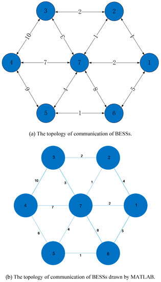 In Figure 3, the weight of each edge represents relative distance between two BESSs and set the distance between BESS 2 and BESS 7 as 1. The result of the classification by the clustering algorithm is shown in Figure 3d. It shows that BESS 1,2,3,7 are in the same cluster while others are in the other cluster. To facilitate communication among the members of every cluster and between two clusters, BESS 7 and BESS 5 are selected as the active leader. The virtual leader is incorporated into BESS 7 and 5.