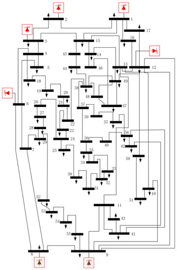 To verify the proposed algorithm, this paper adopts the IEEE 57-bus System as the test system [39]. The IEEE 57-bus System has seven generators and 42 load nodes shown in Figure 4. All generators are replaced by BESSs. According to [40,41,42], is programmed for the dynamic simulation of synchronous generators, which is a toolbox based on the power flow calculation MATLAB Toolbox .