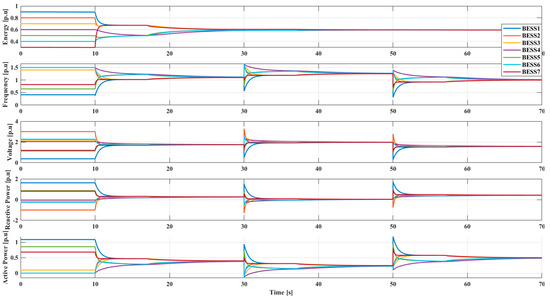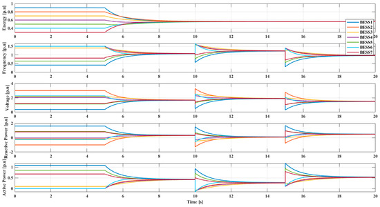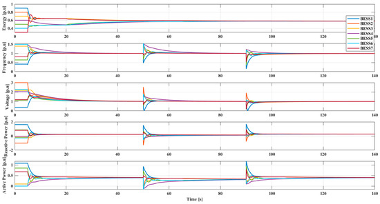 This case is used to cope with the delay of the communication topology proposed under the same operating point change in case 4. All BESSs communicate with each other over a topology structure shown in Figure 3e. Besides, the load change is the same as in case 4. To facilitate grid connection, the reference values of voltage and frequency in the virtual leader are set as 1 . The delay time is set as 100 ms and is far beyond the upper limit, which is defined as 16 ms by the IEEE and international electro-technical commission (IEC) to ensure the stability of the grid [43]. As shown in Figure 9, although communication delay causes some oscillations and a longer time to reach consensus, energy level, voltage, frequency and active/reactive power all can be synchronized. Besides, voltage and frequency can be regulated to 1 , which are the most important conditions for the grid connection of the microgrid.