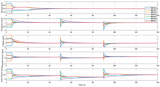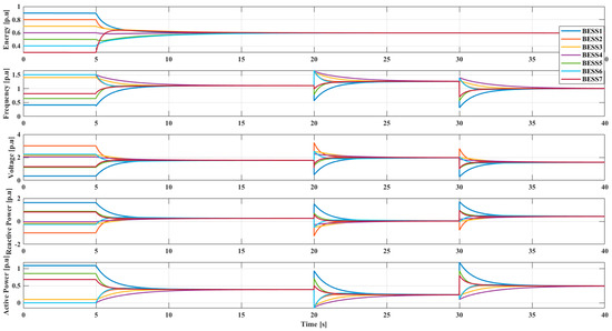 Under the same operating point change as in case 1, this case is used to test consensus controller considering the geographic factor without leaders. Similarly, all BESSs are working in an isolated model, and the communication topology of all BESSs is shown in Figure 3a. At the same time, a load decrement of and a load increment of at each load node occur at 20 s and 30 s respectively. Unlike case 1, the geographic factor is considered and the improved Laplacian matrix is applied in this case. It can be observed in Figure 6 that all BESSs reach consensus in this case slower than case 1, where BESS 4 is the slowest one. That is because there is a longer distance between BESS 4 and other BESSs, and every BESS reaches consensus at a different time according to the distance from its neighbor. Therefore, the convergence speed is affected by the geographic location.