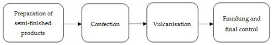 As mentioned, the technologies used by tire manufacturers involve one or two stages. In the former case, the entire tire is produced on a single machine; in the latter, the carcass is typically put together in the first stage, and the basic and supplementary layers and technologies (belt, tread, etc.) are fitted consecutively [17]. The layers of the tire are laid flat inside a drum, which is next filled with air, the pressure of which causes the layers to bond. In the next stage, the structure is subjected to rolling, which shapes the tire, ensures the strong bonding of components and guarantees the removal of excess air that could become trapped between the components. The process output is the raw tire, which undergoes dimensional and shape control tests for errors [15].