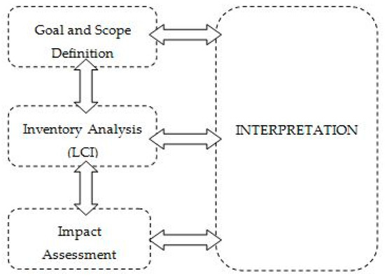 The point of reference for the analysis carried out in the subsequent sections was provided by the regulations and recommendations set out in the ISO 14040 group of International Standards. All four LCA phases were completed: the goal and scope definition, inventory analysis, impact assessment, and interpretation (Figure 2) [31].