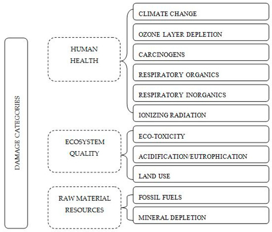The Eco-indicator 99 method (EI99) is a representative of the endpoint methods for environmental impact modeling and assessment. The characterization process defines the environment through the perspective of three main categories of damage, also referred to as environmental damage endpoints: Human Health, Ecosystem Quality, and Resources, which are further described by 11 impact points. The results from the EI99 analysis of impact points are subject to further processing—normalizing, grouping and weighting to obtain a single-score indicator, expressed in Eco-indicator points (Pt). The scale is adjusted so that one point reflects one-thousandth of the annual environmental load of an average European inhabitant [49].