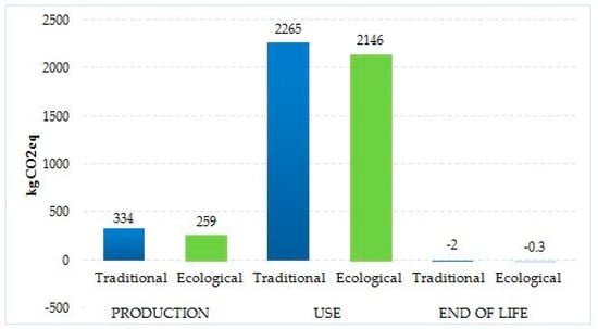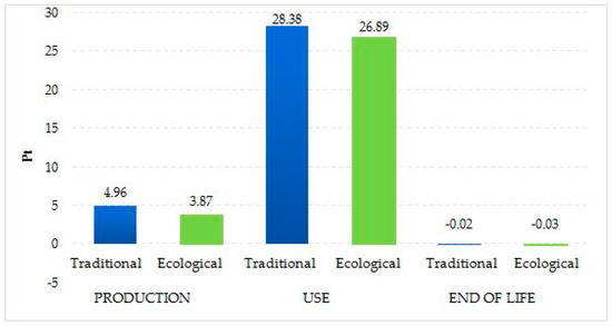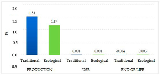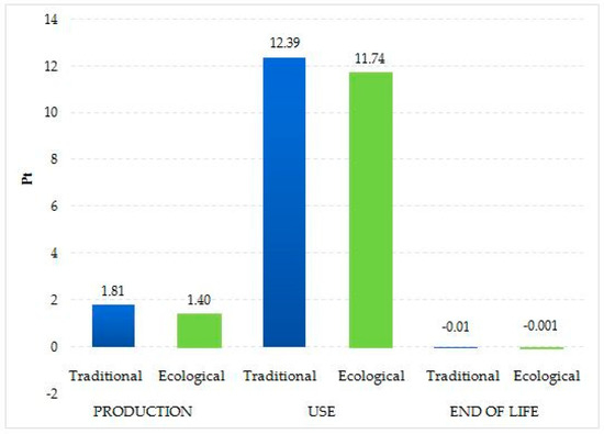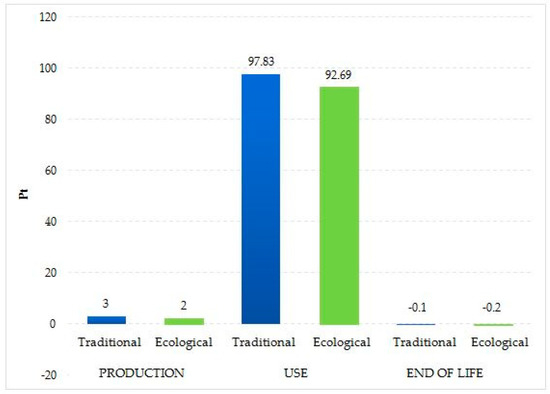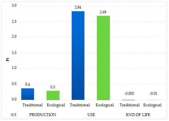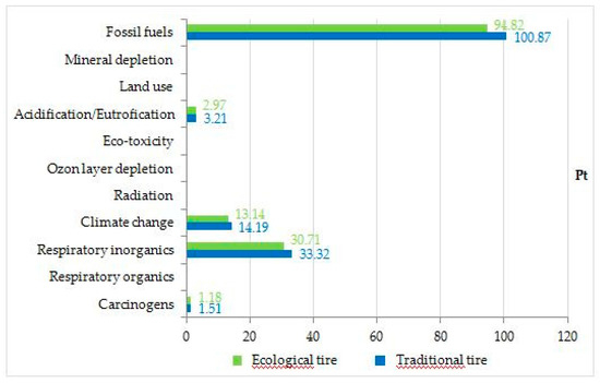 One of the key purposes of LCM is to determine elements in the life cycle of a given product that exert the heaviest impact on the environment. In traditional and ecological tires, the impact categories that were shown to have the most substantial negative consequences for the environment are, in the order of magnitude, the extraction of fossil fuels (an aggregate score for the traditional tire was 100.87 Pt and 94.82 Pt for the eco-tire), emissions of respiratory inorganic substances (33.32 Pt—the traditional tire, 30.71 Pt—the eco-tire), emissions of compounds causing climate change (14.19 Pt—the traditional tire, 13.14—the eco-tire), and acidification/eutrophication emissions (3.21 Pt—the traditional tire, 2.97 Pt—the eco-tire). For both tire technologies, the highest negative emission rates occurred in the use stage (Figure 5).