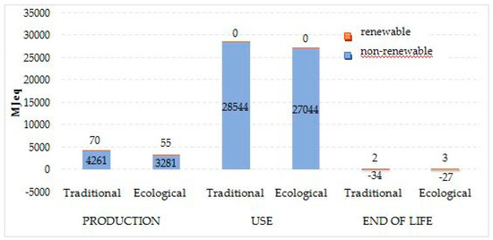 The highest energy consumption was recorded at the use-stage of the car tire life cycle. The most likely explanation for this observation is that setting the car in motion requires burning, in aggregate, extensive amounts of non-renewable fossil fuels. By reducing the fuel consumption, eco-friendly tires improve the average mileage, which translates into energy savings of 1500 MJ within a single life cycle. A similar mechanism is observed during the tire manufacturing stage—the technological process of one ecological tire production consumes 995 MJ energy less compared to the traditional tire manufacturing product (Figure 11).