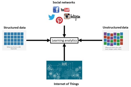 There is another group of data that is important to consider, such as data from social networks. These, through sentiment analysis, provide important information about what the student feels in relation to their university, career or a specific event. In Figure 1, several of the data sources considered in this work are presented—the greater the volume of data that is integrated into the analysis, the greater depth is provided to the analysis in such a way that the personalization of learning is optimal [28].
