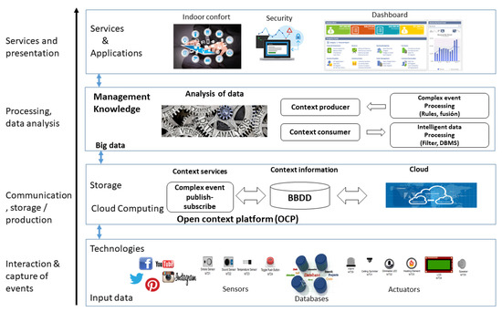 Based on the components mentioned in the previous sections, a comprehensive data analysis model is proposed that contributes to the detection of students’ needs. In Figure 3, a solution that is composed of layers is presented. In the layer of interaction and capture of events are all possible data sources—as it is a generic architecture, it is coupled to any type of infrastructure [39]. This layer is intended to collect all the information from both traditional systems and sensors and actuators found within the university campus. In addition, the university’s social networks are considered sources of data, which allows any event or information generated from a career or university to have followers and detractors. By performing an analysis of this information, the level of acceptance can be obtained and decisions based on these results can be made.