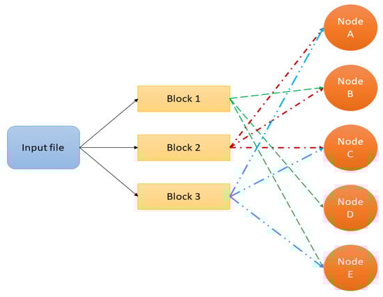 HDFS allows the data file to be able to distribute the information to different devices, as opposed to being saved on a single machine [43]. The data are then distributed across hundreds or thousands of nodes for processing. This is where redundancy is provided and data are repeated or replicated across multiple nodes and fault tolerance. If any node fails it is automatically replaced, as shown in Figure 4.