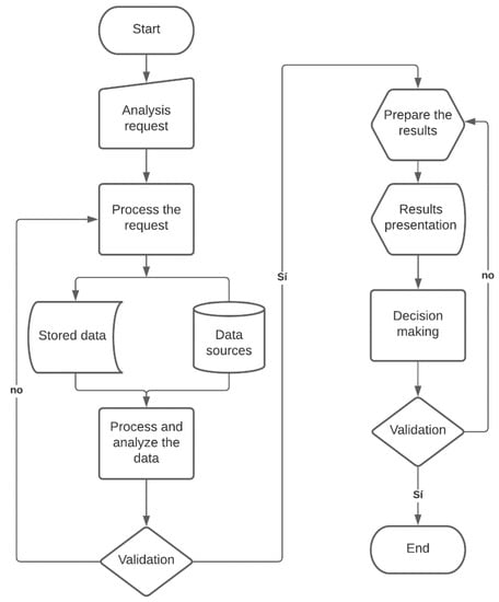 The analysis allows the identification of the patterns that are presented in the data; with these results it is possible to classify the individuals by means of data mining algorithms that detect in a granular way the possible problems that exist in a certain population [41]. In the following flow, the model performs a validation of the results. If there is a variable that does not correspond or the inclusion of data from other sources is necessary, the process returns to the stage of “Process of the request”, where they are loaded again the data corresponding to the validation carried out. On the contrary, if the validation is correct, the process continues the flow to the next level where it prepares the results by means of different tools established in the big data model [55].