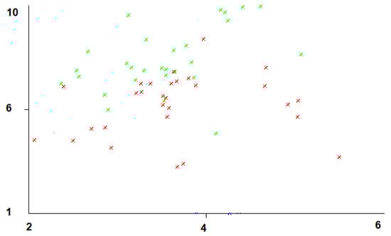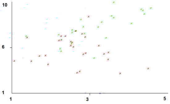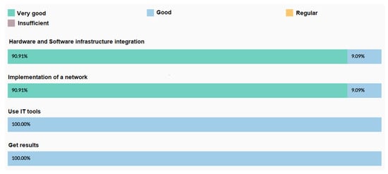 The horizontal-axis represents the interaction time that students have with IT tools and the vertical-axis represents the general grades in the subject evaluated. The horizontal-axis scale considers the use of IT from at least 2 to 6 h of dedication to the use of IT in the aforementioned subject. The red marks represent the students of the online education modality and the green marks represent the students of the face-to-face modality. The IT refers to the LMSs—the attendance and academic record systems. To provide greater granularity, the data from the surveys passed to the 50 students were added. When processed, it was found that face-to-face students perform better with office tools, as well as a variety of different utilities. In the online mode, satisfaction is low and several students do not use tools such as Excel or have other utilities as shown in Figure 8. In this figure, several changes are observed. One of them is that now the measurement is carried out between the grades obtained by the 50 students in the second week of the 2020-2 period, where a survey was run regarding the availability and use of office tools (Excel, Access, web page designs with templates, etc.). The horizontal-axis in the graph represents the values with which the survey questions were scored, with 1 as the lowest level and 5 as the highest level.