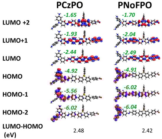 3D electron density distribution of the frontier orbitals of PCzPO and PNoFPO D-A moieties, computed at the B3LYP/6-311G(d,p) level of theory. Energy levels (eV) of each orbital is shown in green, and the HOMO-LUMO gaps are shown at the bottom of each column.