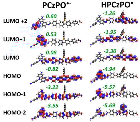3D electron density distribution of the frontier orbitals of PCzPO•- and H-PCzPO• calculated under DFT-B3LYP/6-311G(d,p) level of theory.