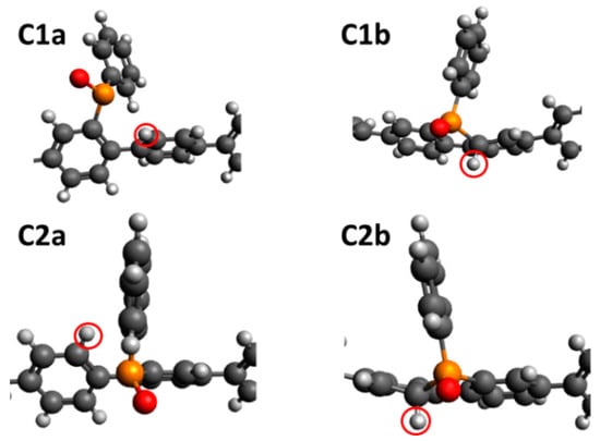 Since phosphorous is the least electronegative atom for the polymer catalyst, atoms directly bonded to it become negatively charged due to induction, making them preferred sites for H+ binding. As depicted in Figure 1, the phosphorous atom of the P = O group is bonded to 3 carbon atoms (C1 to C3) and an oxygen atom (O). C1 and C2 are the carbons of the phosphindole group with C2 being close to the acceptor group while C3 is the carbon of the phenyl group. Table 3 shows that H+ bound more strongly to C1 and C2 than to O. The binding of H+ to C1 and C2 led to various possible configurations, as shown in Figure 6. The more stable configurations, C1a and C2a, were generated when H+ binds from the top, along the plane of the phosphole ring. In this configuration, the bond of C1 or C2 to the phosphorous was broken to open up the phosphole ring. This allows the C1 or C2 to maintain sp2 hybridisation and maintain the extended π conjugation of the molecule. But H+ may also bind perpendicular to the plane of the phosphole ring (C1b and C2b in Figure 6). This does not break the bond to phosphorous but is less stable because it converts the carbon binding site to an sp3 hybridised tetrahedral centre, thus, breaking the planar configuration of the ring and interrupting the π conjugation. We note that the difference in H+ binding energies for proton binding onto the three C and the O site was very small (<0.2 eV) as seen in Table 3. This means that the H+ may realistically bind to any of these sites to form H-PCZPO•. In fact, H+ may very well bind to sites other than the ones discussed here since the charges of the C atoms along the P = O acceptor group (not shown here) did not differ significantly. However, for practicality, we proceeded with the assumption that these sites are the most probable H+ binding sites.
