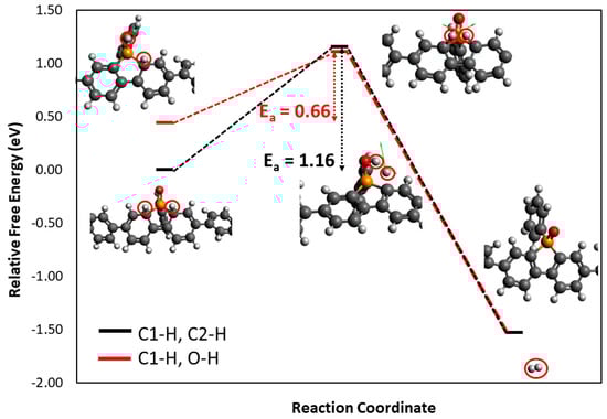 In an intramolecular reaction mechanism, the P-H• molecule would be reduced and protonated for a second time to form a P-H2 intermediate. For simplicity, it was assumed, based on the results discussed above, that the first proton would bind to C1. As shown in Figure 7, two possible P-H2 states were then considered leading to two possible intramolecular mechanisms: (i) the second H+ binds to C2 (C1-H-C2-H) and (ii) the second H+ binds to O (C1-H-O-H). C1-H-C2-H was more stable compared to C1-H-O-H. However, this results in the higher activation energy for the C1-H-C2-H pathway (Ea = 1.16 eV, black line in Figure 7) compared to the C1-H-O-H mechanism (Ea = 0.66 eV, the red line in Figure 7). This means that the H2 formation would proceed faster through the C1-H-O-H mechanism from a kinetic perspective. Thus, H2 formation on PCzPO will likely proceed through an intramolecular mechanism after overcoming the barrier of 0.66 eV. We also elucidated the intramolecular H2 formation using PNoFPO to show that PNoFPO indeed generated a very similar reaction coordinate and barrier (0.61 eV) to PCzPO moiety (Figure S3).