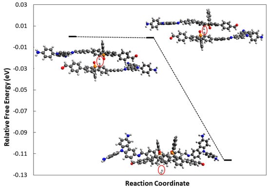 To study the intermolecular mechanism, a reaction between two molecules of H-PCzPO• with the most stable configuration, C1a (ΔGH = 2.83 eV), was initially chosen as the starting structure. However, the optimisation of two H-PCzPO• moieties with C1a configurations led to the formation of a phosphorous-phosphorous bond which inhibited the interaction of the H atoms and H2 formation (Figure S4). Because of this, C1b configuration was chosen as a starting structure to find the MEP for the formation of H2. The calculated reaction coordinate for this mechanism (Figure 8) shows a hydrogen formation reaction with activation energy (Ea) equal to zero. This implies a barrierless and spontaneous (ΔG = −0.116) formation of H2 through this intermolecular reaction mechanism. However, it is important to note that the two P-H molecules needed to be oriented such that the hydrogens involved in the reaction are closely pointed to each other, implying that intermolecular H2 formation is only likely to occur when the repulsion between polymers is low. The higher HER rate from the higher molecular stacking of PCzPO polymers might be possibly due to the higher possibility of forming H2 via an intermolecular reaction mechanism.