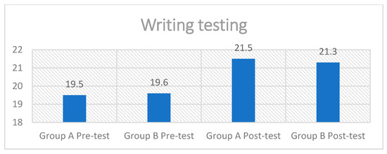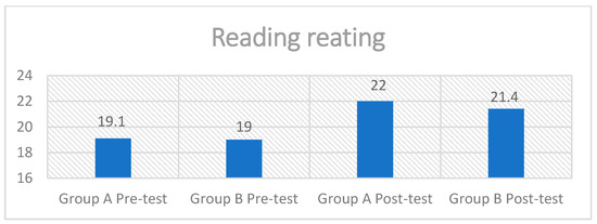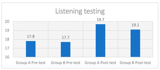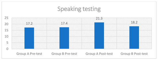 Figure 1, Figure 2, Figure 3 and Figure 4 shows the results of the initial testing and final testing of the two groups for comparison of the results obtained. The pre-test results of the two groups are approximately the same (the Group A pre-test and Group B pre-test lines practically merge). The results of the post-tests for Group A are higher in all categories (reading, writing, listening and speaking).