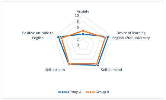 As we wanted to implement a comprehensive assessment of the virtual environment, all the students participating in the experiment were offered to complete a motivation questionnaire anonymously. All the students passed these tests through the online platform Moodle. The closed-ended questions were designed to explore the students’ perceptions about teaching and learning, defining five indicators: desire for learning English after university (Q1–Q2), anxiety (Q3–Q4), positive attitude to English (Q5–Q6), self-esteem (Q7–Q8) and self-demand (Q9–Q10).