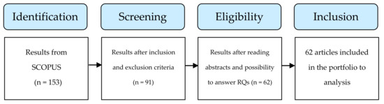 After this screening, the next step consisted of a preliminary analysis of the selected articles with complete and accessible texts. Eligibility (step 3) consisted of reading the abstracts to verify if the selected articles might answer RQ1, RQ2, RQ3, and RQ4, this being a second refinement. After this second refinement, we were able to obtain the portfolio of articles included to perform the review (step 4).