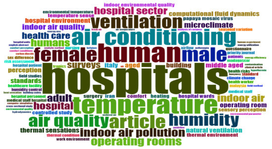 It is visible that the most used keyword, in combination with thermal comfort, is “hospitals”. It can be seen that this information is deducible since most studies are carried out in hospitals. Only four studies differ from this reality, the studies in [19,20] which were carried out in elderly centers, as well as the studies in [21,55] which were carried out in health center facilities.