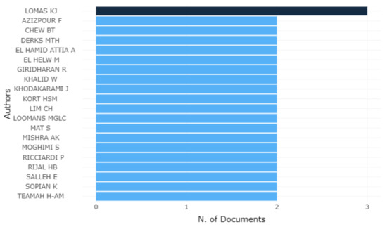 According to Google Scholar, four articles appear as the most cited: Lomas and Giridharan [53], 124 citations; Hwang et al. [45], 123 citations; Chow and Yang [41], 122 citations and Sodha et al. [38] with 120 citations. Authors with more publications are shown in Figure 4.
