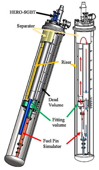 - Narcisi, V.; Giannetti, F.; del Nevo, A.; Tarantino, M.; Caruso, G. Post-test simulation of PLOFA transient test in the CIRCE-HERO facility. Nucl. Eng. Des. 2019, 355, 110321. [Google Scholar] [CrossRef]