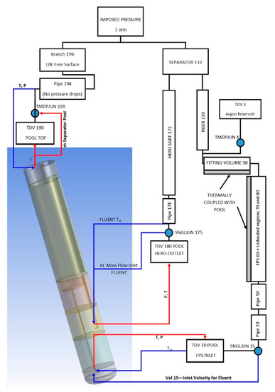 As a consequence, a coupled STH/CFD application represents the best option for obtaining a suitable representation of the selected operating conditions. The computational domain was subdivided into several parts and each region was assigned to the code that could better represent its phenomena. The regions were consequently connected in order to allow mass and heat transfer between the various domains.