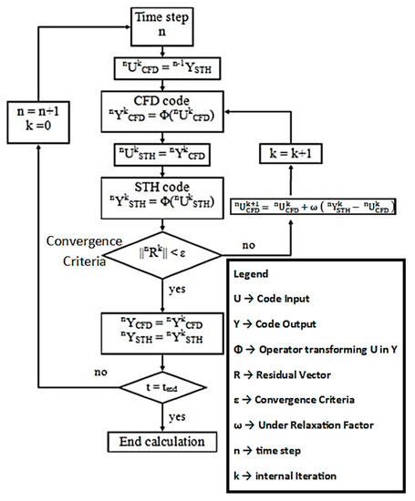 Each time-step is solved iteratively: several internal iterations are performed in order to achieve a suitable matching between the predictions of the CFD and STH codes at the thermal and fluid-dynamic boundaries. In particular, CFD firstly performs its calculation providing RELAP5 with updated values for pressures, mass flow and heat fluxes (YCFD). RELAP5 subsequently performs its calculation considering the updated boundary conditions (USTH = YCFD) and returns to the CFD code the updated boundary conditions (YSTH) to be compared with the previous ones. If the resulting changes are sufficiently small (i.e., the obtained residual R is small), the calculation moves to the following time-step; if not, a new internal iteration starts and the calculation for the current time-step is repeated until the convergence criteria are met.