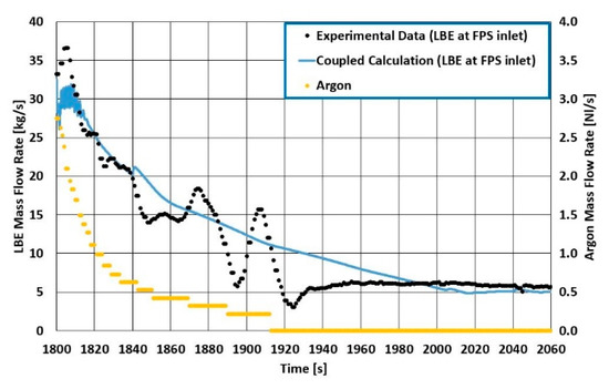 Comparison of the measured and calculated Lead Bismuth Eutectic (LBE) mass flow rates at the Fuel Pin Simulator (FPS) inlet section.