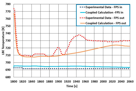 Comparison of the measured and calculated LBE temperatures at the FPS inlet and outlet sections.
