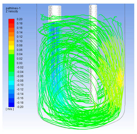 Pathlines for the fluid exiting the HERO steam generator and entering the FPS for t = 2040 s.