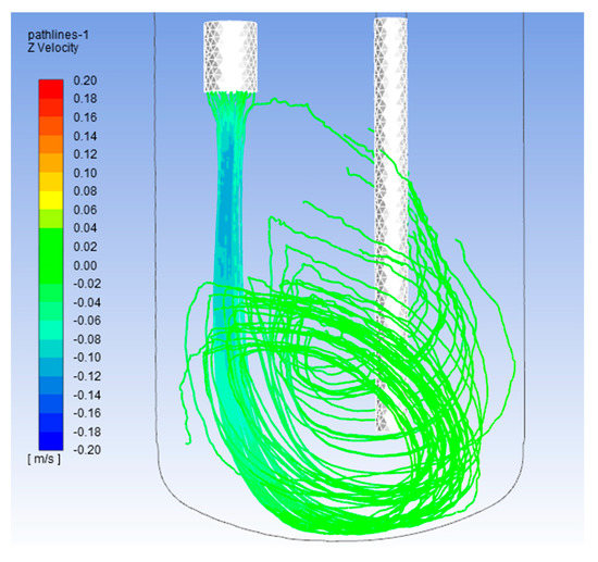 Pathlines for the fluid exiting the HERO steam generator and entering the FPS for t = 1800 s.