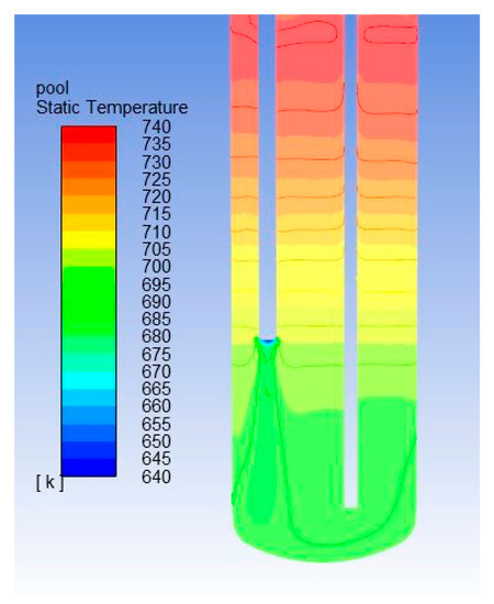 On the other hand, after the decrease of the calculated mass flow rate occurring in the first minutes of the transient, the recirculation region becomes definitively smaller. This implies a sort of shortcut for the fluid exiting from the HERO-SGBT, which enters the FPS. In fact, the flow no more undergoes a strong mixing with the fluid in the pool, maintaining a temperature closer to the one predicted at the outlet of the steam generator. This phenomenon may be responsible for the predicted temperature decrease at the inlet of the FPS occurring in correspondence of the time interval in which the lower mass flow rates are predicted (1960–2060 s in Figure 6).