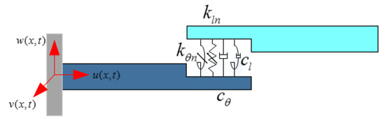 For the sake of completeness, the effects of the axial displacement in the equation of motion of the bolted cantilever beam structure are taken into account. So, the component of stress corresponding to the strains of Equation (13) are given by