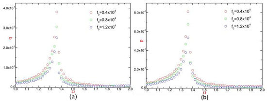 Figure 6a,b describe that the peaks of the frequency response curve are inclined to the right. This asymmetry reflects the existence of a certain degree of nonlinearity in transverse and bending vibration. Specifically, near the right side of the resonance frequency, there is a frequency corresponding to two amplitude of vibration, which is to say, there is a certain degree of uncertainty. Furthermore, no matter the transverse vibration or the bending vibration, there will be typical bifurcation phenomenon. Of course, if the bifurcation phenomenon is further developed, it may cause strong uncertainty chaos.