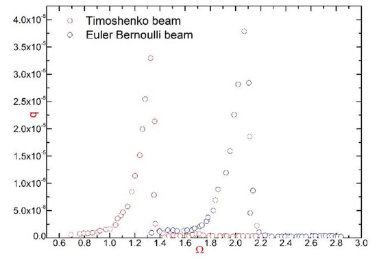 slowly upsurge to their respective resonance peaks, and then rapidly drop to near 0. All of them will expose a certain level of bifurcation and hard type characteristics. Compared with the Euler Bernoulli beam, the first order generalized coodinate of the frequency response curve of the Timoshenko beam in transverse direction has similar behavior, but amplitude and resonance frequency are lower than that of the Euler Bernoulli beam. The shear deformation is considered in the Timoshenko beam, which results in the internal energy dissipation due to the shear deformation, so the resonance peak of the Timoshenko beam is slightly lower than that of the Euler Bernoulli beam. Additionally, due to the influence of the moment of inertia, the stiffness of the Timoshenko beam becomes smaller and the resonance frequency becomes smaller.