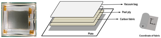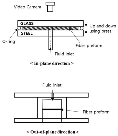 Binder-treated fabric was manufactured using an epoxy binder applied uniformly (5 ± 1 g/m2) to one side of Toray’s twill-woven carbon fabric roll. For the preforming process to prepare the preform specimen, the carbon fabrics were laminated 8-ply (Figure 1) in the same direction and compressed using a vacuum bag, and, if required, heat treatment was performed for 30 min. at 110 °C in a convection oven. For investigating the effects of the binder, three types of preform specimens were fabricated: neat fabric preform, binder-treated fabric preform without heat treatment (preforming at room temperature), and binder-treated fabric preform with heat treatment (preforming at 110 °C). Every case was fabricated with the same size (300 mm × 300 mm), and in the measurement of permeability the fiber volume fraction of the preform was determined by fixing the thickness using the upper and lower jigs before the test fluid injection (Figure 2). The fiber volume fraction was calculated except for the binder volume fraction because it was negligibly small (<3%) compared to the amount of fiber (Table 1).