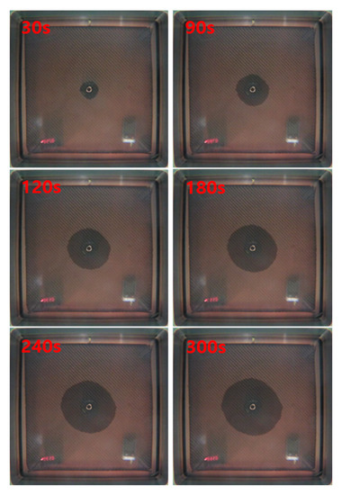 The expression was used to obtain the unsaturated permeability by observing the flow front over time, where the injection pressure was constant. In the above expression, is the volume-averaged fluid velocity, is the unsaturated permeability, and and represent the viscosity of the fluid and the pressure gradient, respectively. Figure 3 shows the change in the flow front of the resin over time. Using the method suggested by Adams et al. [17] and assuming that the flow front is elliptical, the permeability was obtained through curve fitting using the least squares method. With the measurement system shown in Figure 2, the test for each case was conducted 5 times and the average value is shown.