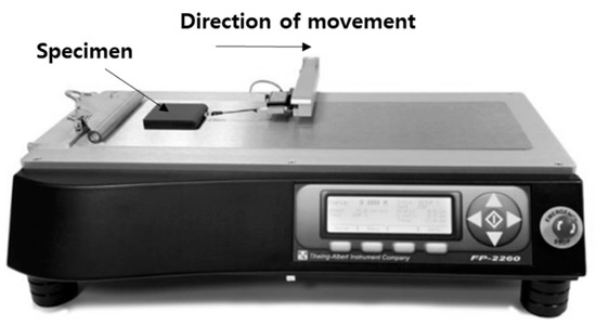 In this study, the friction coefficient between the fabric and mold surface, as well as the fabric to fabric friction coefficient, was measured as a function of the presence of the binder and the temperature conditions. The kinetic friction coefficient was measured using an FP-2260, which can control the movement speed of specimen, supplied by the Thwing-Albert Corporation, with a 20 mm/s sliding speed and a 0.5 kg weight (Figure 4). Because the fabric used in this study had an epoxy binder on one side only, the test cases were set up as shown in Figure 5. In Figure 5, cases 1–3 were intended to examine the change in the coefficient of friction between fabrics according to the conditions of the binder treatment, and case 4 was intended to show the same change between the fabric and the metallic mold.