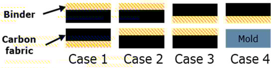 As the demand for composite materials with high strength and light weight increases, composite manufacturing processes are being investigated to reduce production costs. Among these processes, liquid composite molding (LCM), including resin transfer molding (RTM) or structural reaction injection molding (S-RIM), is advantageous for manufacturing complex-shaped products. These inexpensive processes can be used without an autoclave process [1,2,3,4]. In LCM, the fiber is preformed in the mold prior to injecting resin. The fiber preform process using a binder is recommended, because fiber layers should be bonded to each other to fix the desired shape. There are many kinds of binders. Depending on the materials used, they can be classified into thermoset and thermoplastic binders and may be powder or liquid-type binders. As the amount of binder used in LCM increases, it can easily fix a preform of a complex shape owing to the high adhesion between the fibers. However, there are several associated issues preventing the large amount of binder use, including changes in the shear properties and the friction coefficient of the fiber preform, as well as the poor permeability. Consequently, optimization studies attempting to identify an efficient preform process by analyzing the effects of binders are needed [5,6,7].