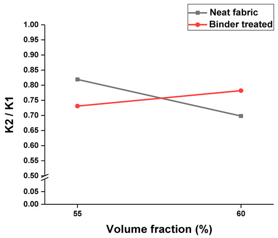 Figure 6 shows the permeability in the in-plane direction for each fiber volume fraction. The tests were conducted on two cases with fiber volume fractions of 55% and 60%. The permeability of the fiber in the 90° direction (having a maximum flow velocity) is K1, and the permeability of the fiber in the 0° direction (having a minimum flow velocity) is represented by K2. In each measurement, the neat fabric preform and binder-treated fabric preform with a heat treatment during the preforming process were used to investigate the effect of the binder on the in-plane permeability. The average value of each test is indicated, and the error bar shows the maximum and minimum of the sample. As shown in Figure 6 and Table 2, the permeability of the binder-treated fabric preform decreased in every case, regardless of in-plane direction (K1, K2) and the fiber volume fraction. It can be inferred that the treated binder hindered the impregnation of resin in the preform, decreasing the permeability by approximately 80% for K1 and 82% for K2, at a 55% fiber volume fraction, and 80% for K1 and 77% for K2, at a 60% fiber volume fraction. In spite of the consideration of the amount of porosity reduction due to the binder content noted in Table 1, the permeability in the in-plane direction of the binder-treated fabric preform significantly decreased, which means that the binder treatment changed the permeability characteristics of the fabric preform itself. In addition, the permeability of the fiber tended to decrease as the fiber volume fraction increased in both the K1 and K2 directions, regardless of the binder treatment, and especially for neat fabric, which exhibited a larger decrease (K1: −16%, K2: −28%) than that of the binder-treated fabric. It is assumed that the permeability of the binder-treated preform, which had already been reduced due to the effect of the binder, was less affected by the decrease in the fiber volume fraction than that of the neat fabric preform.